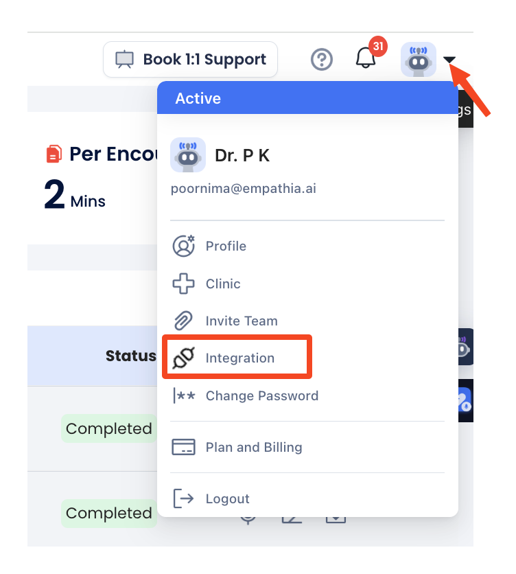 2. On your Empathia web portal, click on the down arrow next to your profile icon on the top right corner, then select "Integration" (contact support@empathia.ai if you do not see this button).