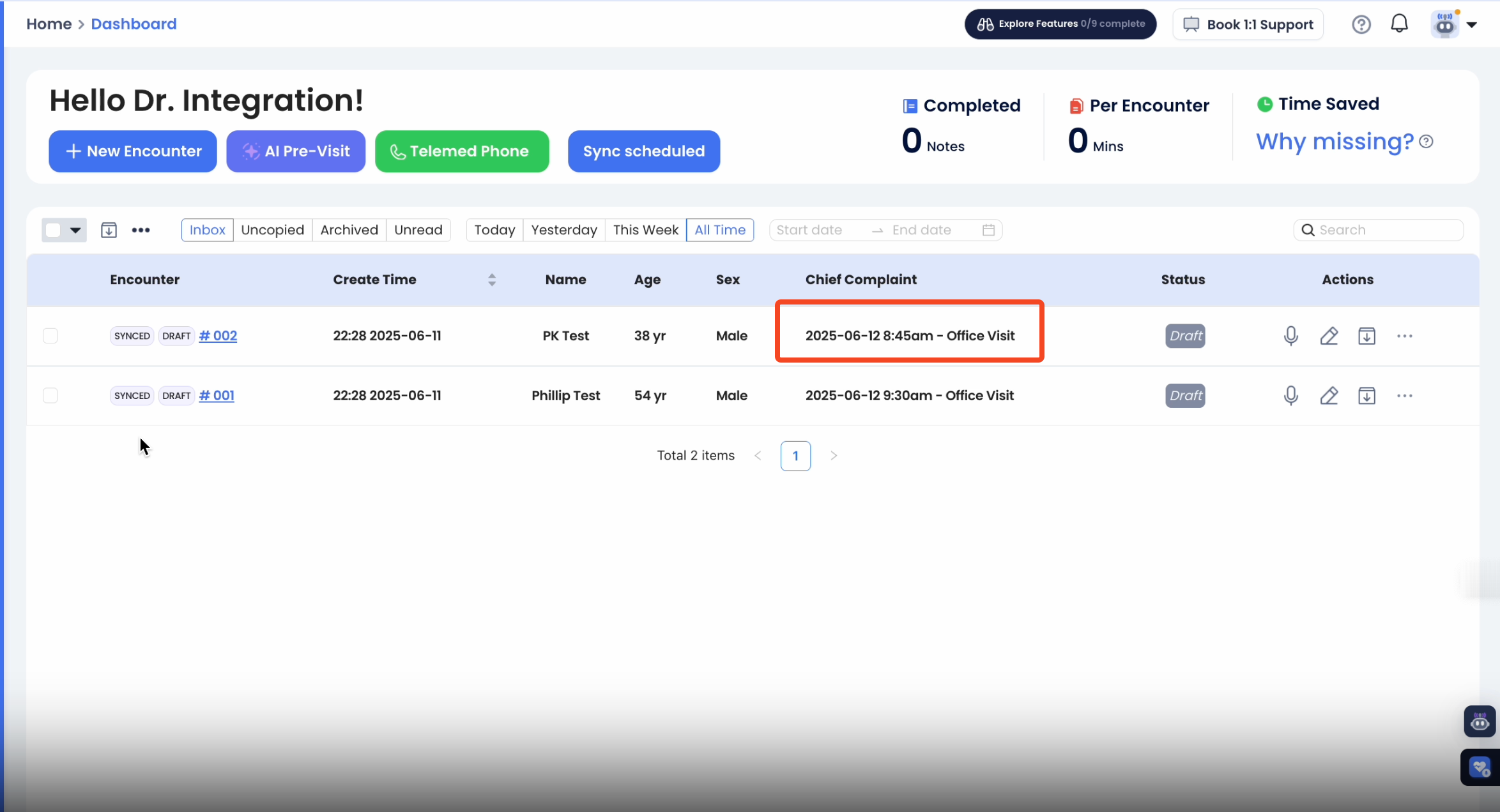 2. Review Intake Summaries - An intake summary for the patients scheduled for that day will appear in your encounter list, along with the scheduled appointment time. This will include name, age, gender and relevant medical history for that patient.