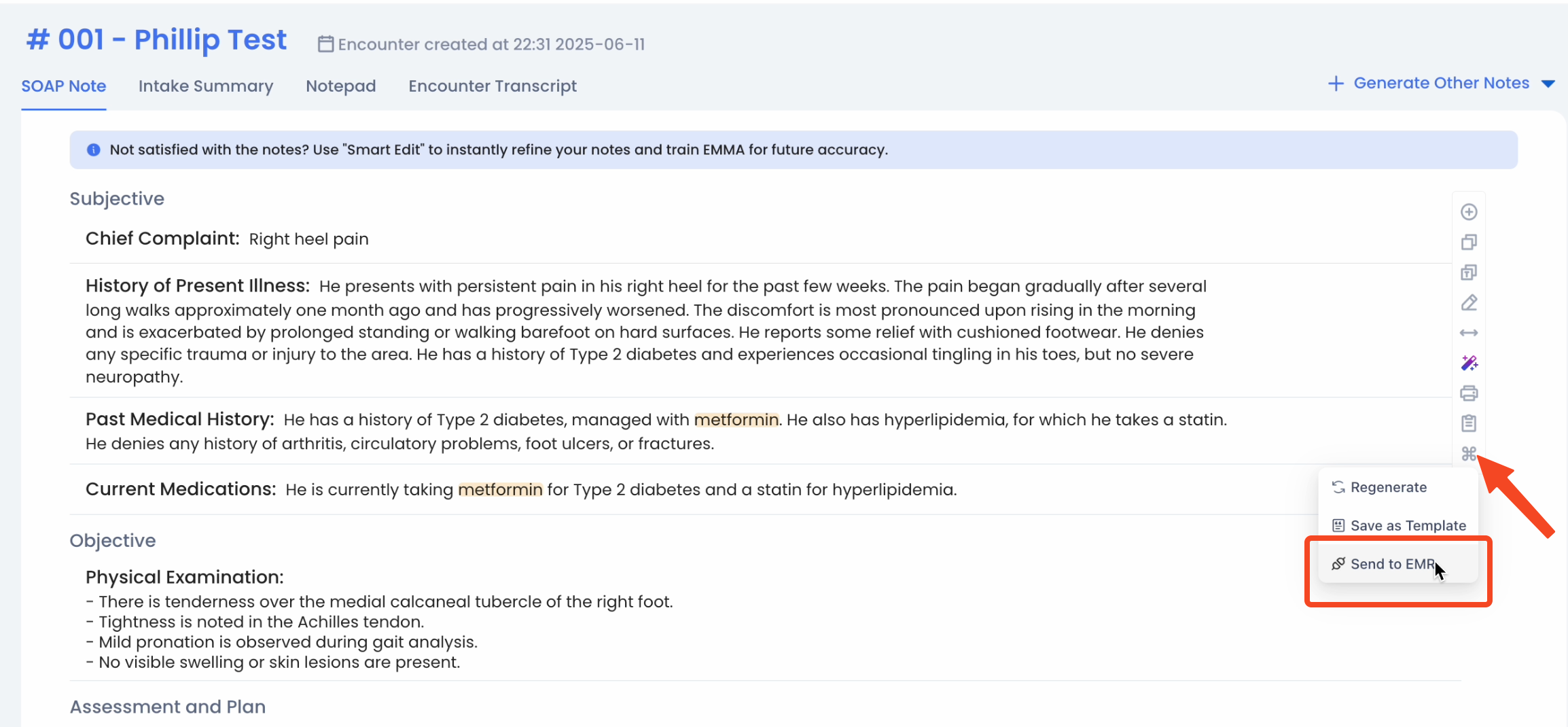 4. Push note to EMR - Once you review the SOAP note or the Consult letter, click "Send to EMR" to push the note directly to the patient chart in Accuro.