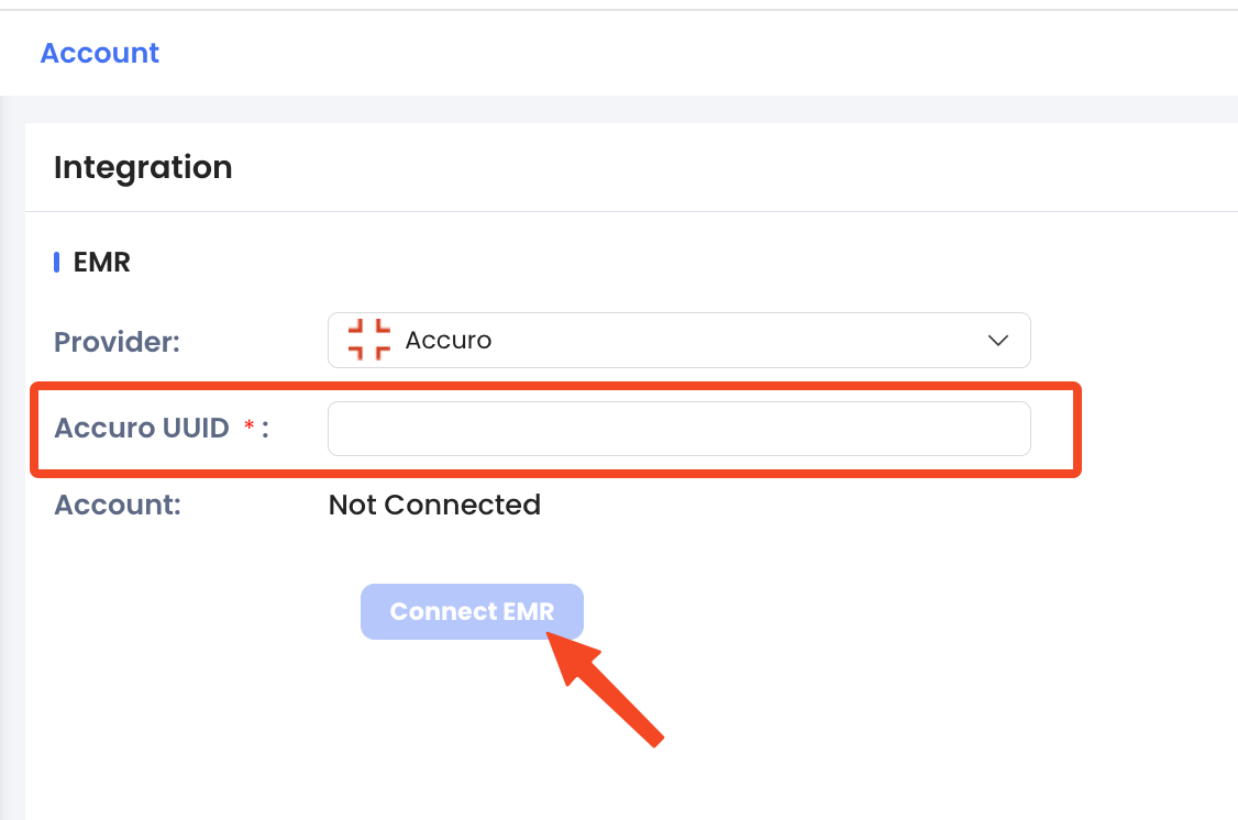 2. Select "Accuro" EMR from the drop down menu, enter your Accuro UUID & click "Connect EMR"