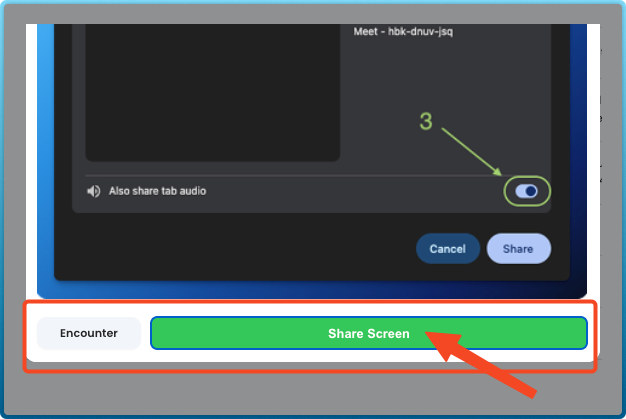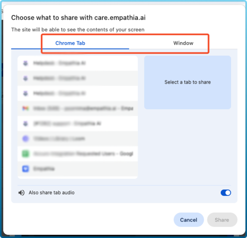• When you click on Share Screen you will be given a choice to share a Google Chrome Tab, an entire Window or your entire screen (Mac OSusers can only share web browsers & NOT desktop apps).