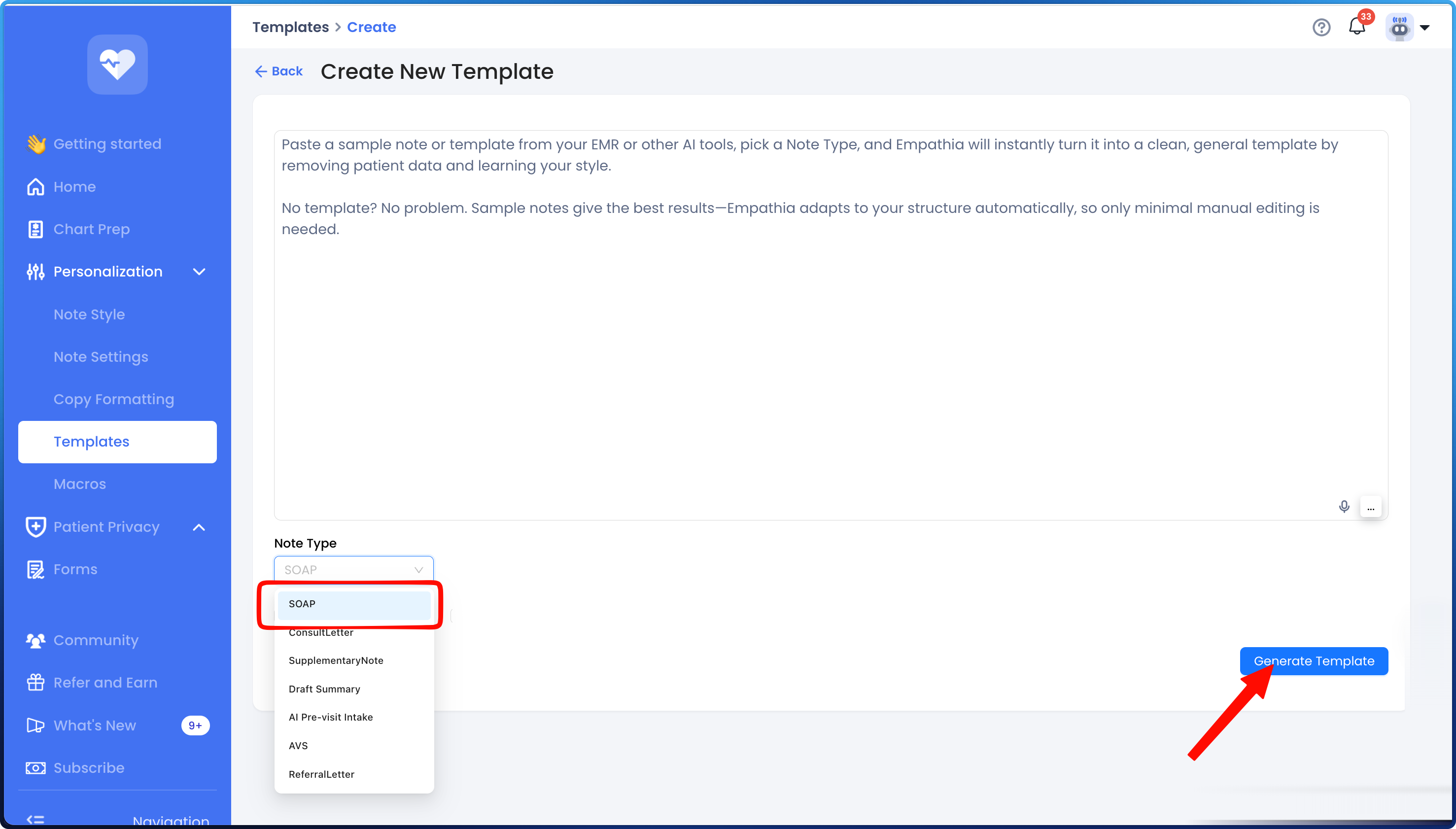 3. Choose Note Type and click on Generate Template. The types of notes include -