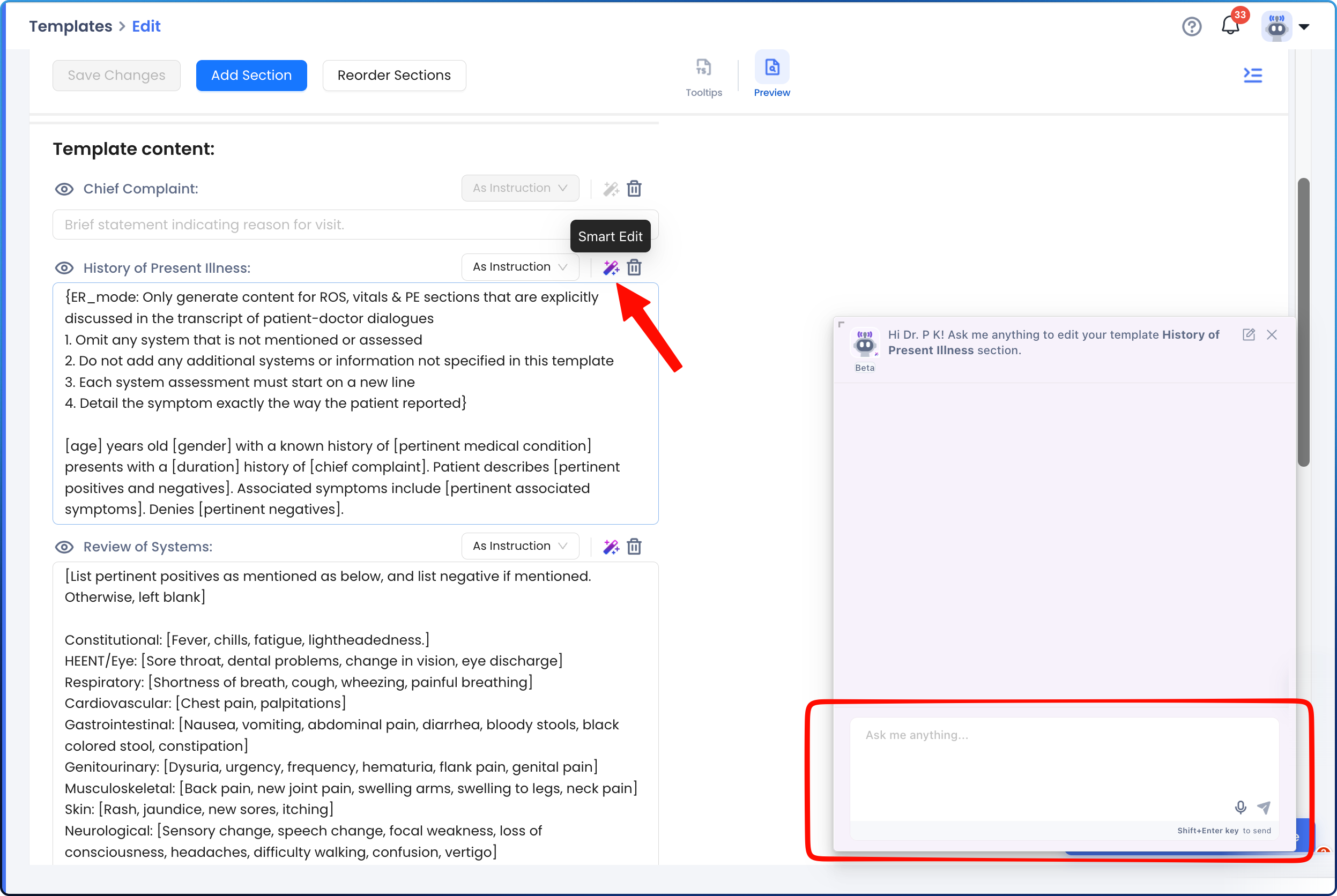 6. Edit with AI Assistance: Click on the purple magic wand icon next to each section heading to open an editing window similar to the Smart Edit feature. Here, you can chat with Emma AI to refine your template further.