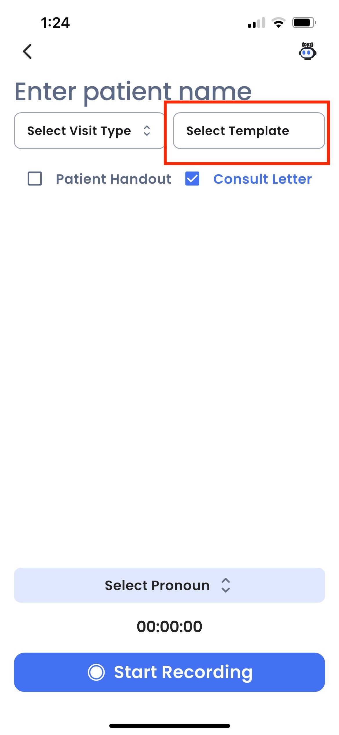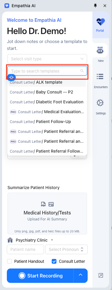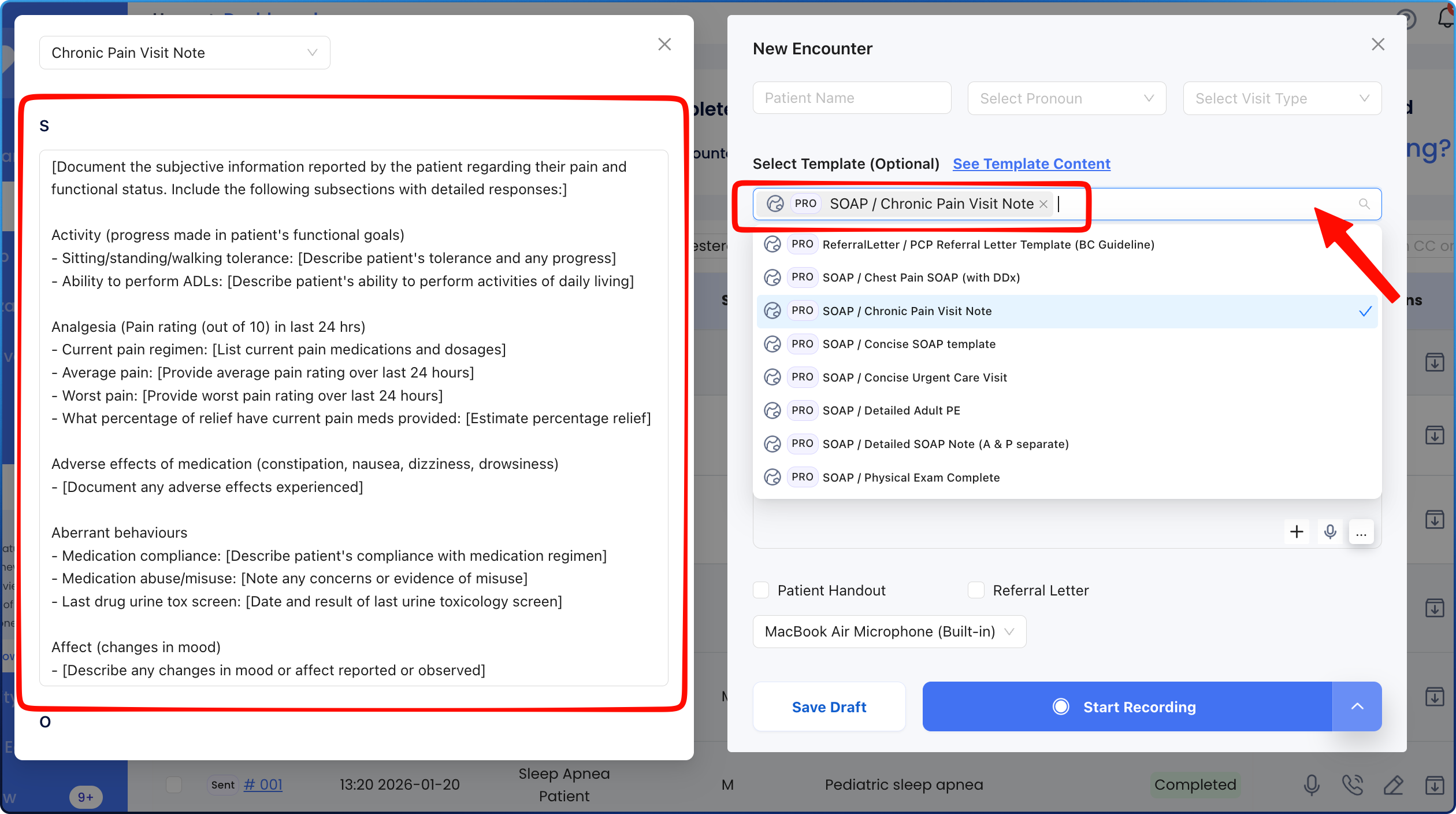 1. Select a template from the drop down menu from the recording modal. If you haven't created any templates yet, you will see a list of curated templates for your specialty in the drop down menu. Click on any to review the contents.