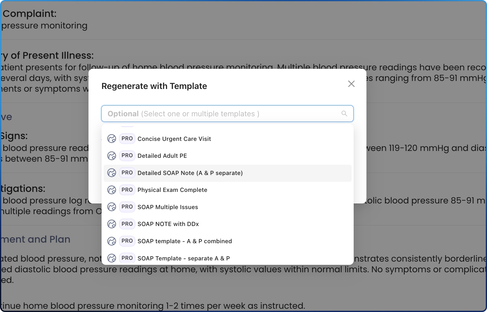 2. After the note is complete, you can change the template by clicking on the icon in the top row to "Regenerate with Templates"