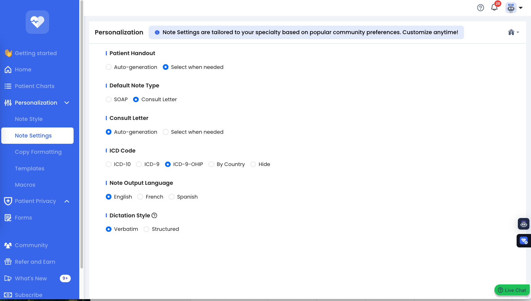 2) Next, you will see "ICD code" as one of the sections. Select which ICD code you prefer such as ICD-10, ICD-9, ICD-OHIP or if you wish to use it by country. Below is a visual representation of this.