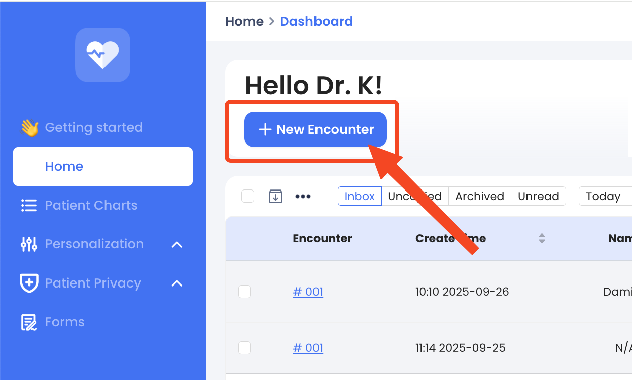 Enter Patient name after opening "+New Encounter". Below is a visual representation of this.