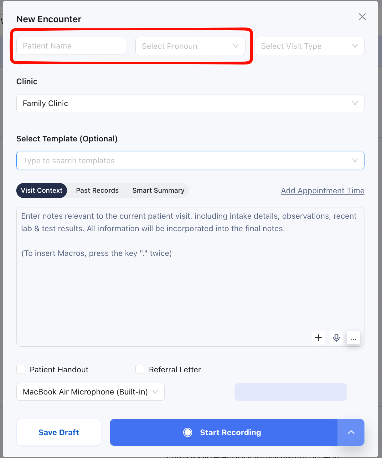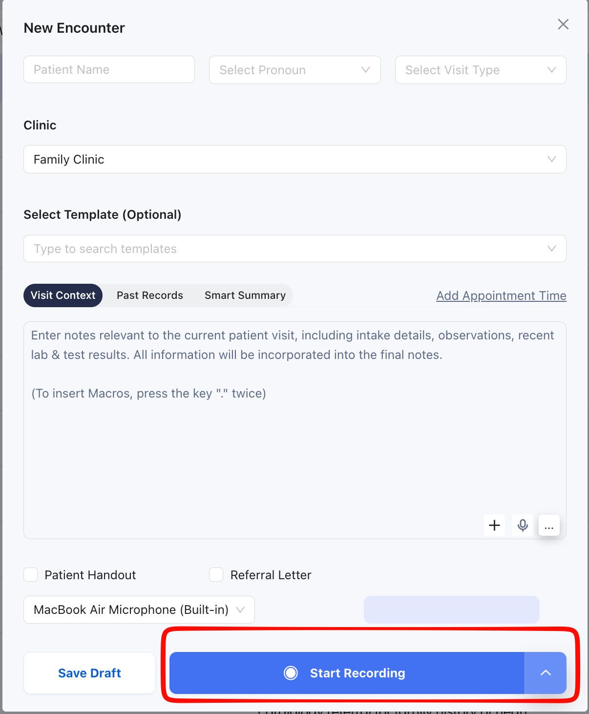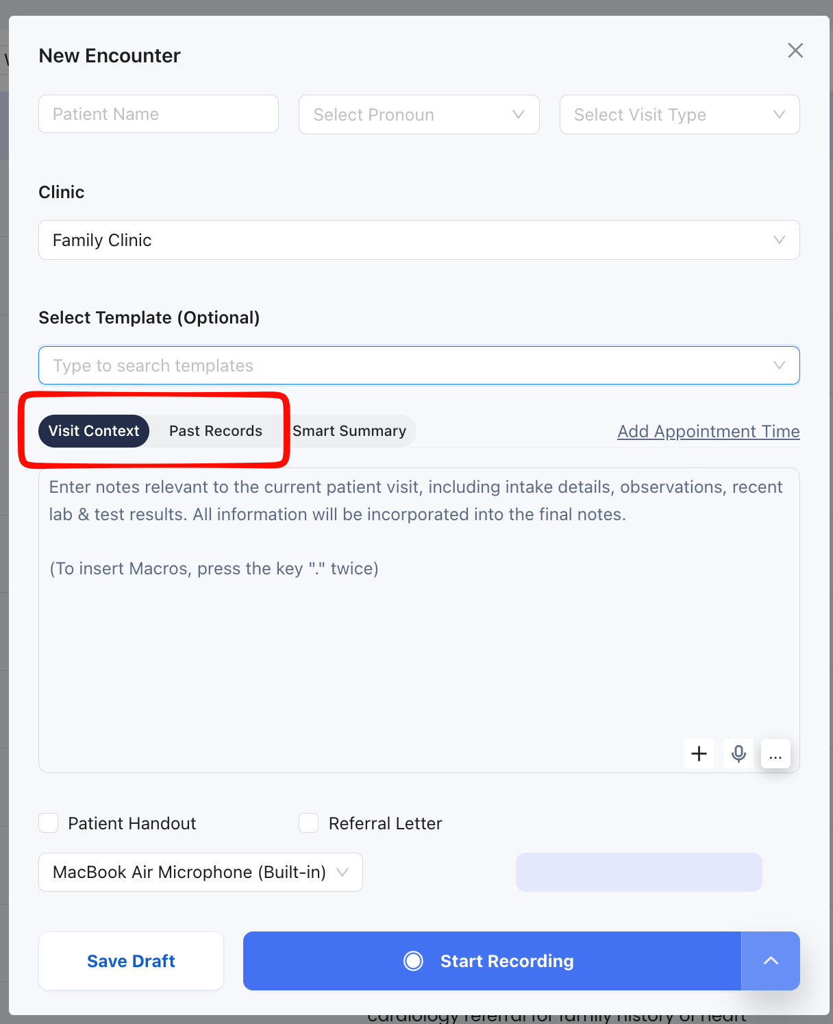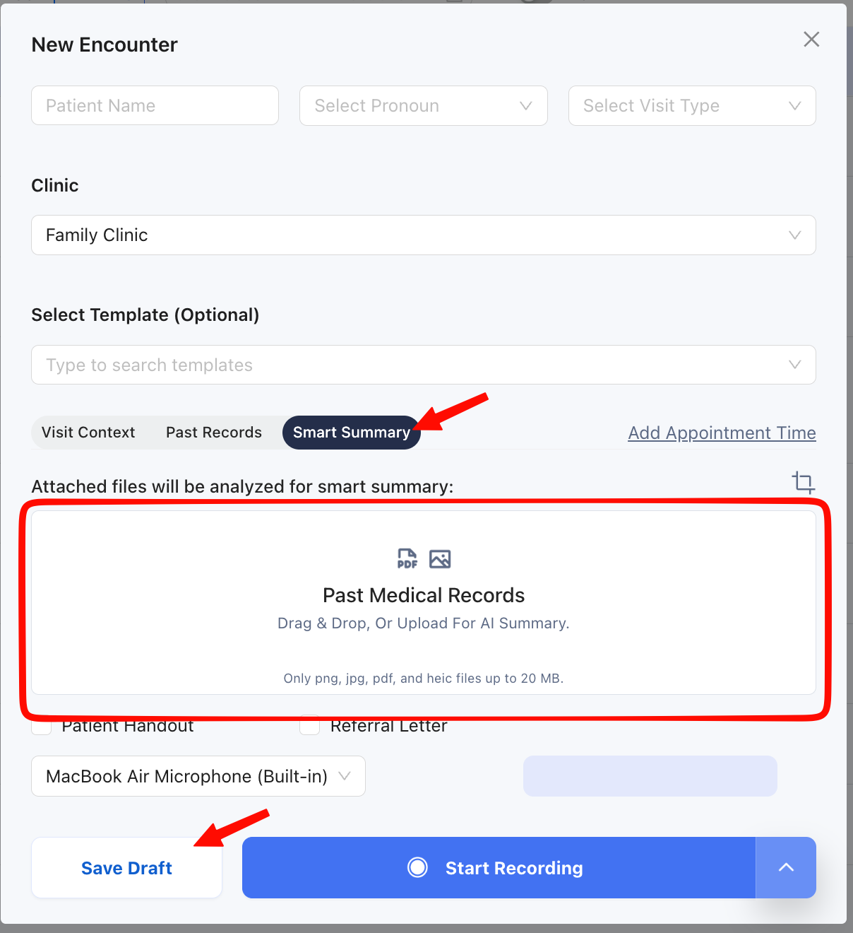 Use the Smart Summary tab to upload documents & include an AI generated summary of the information in your final note. You can also "Save Draft" after uploading documents to prepare for appointments ahead of time.
