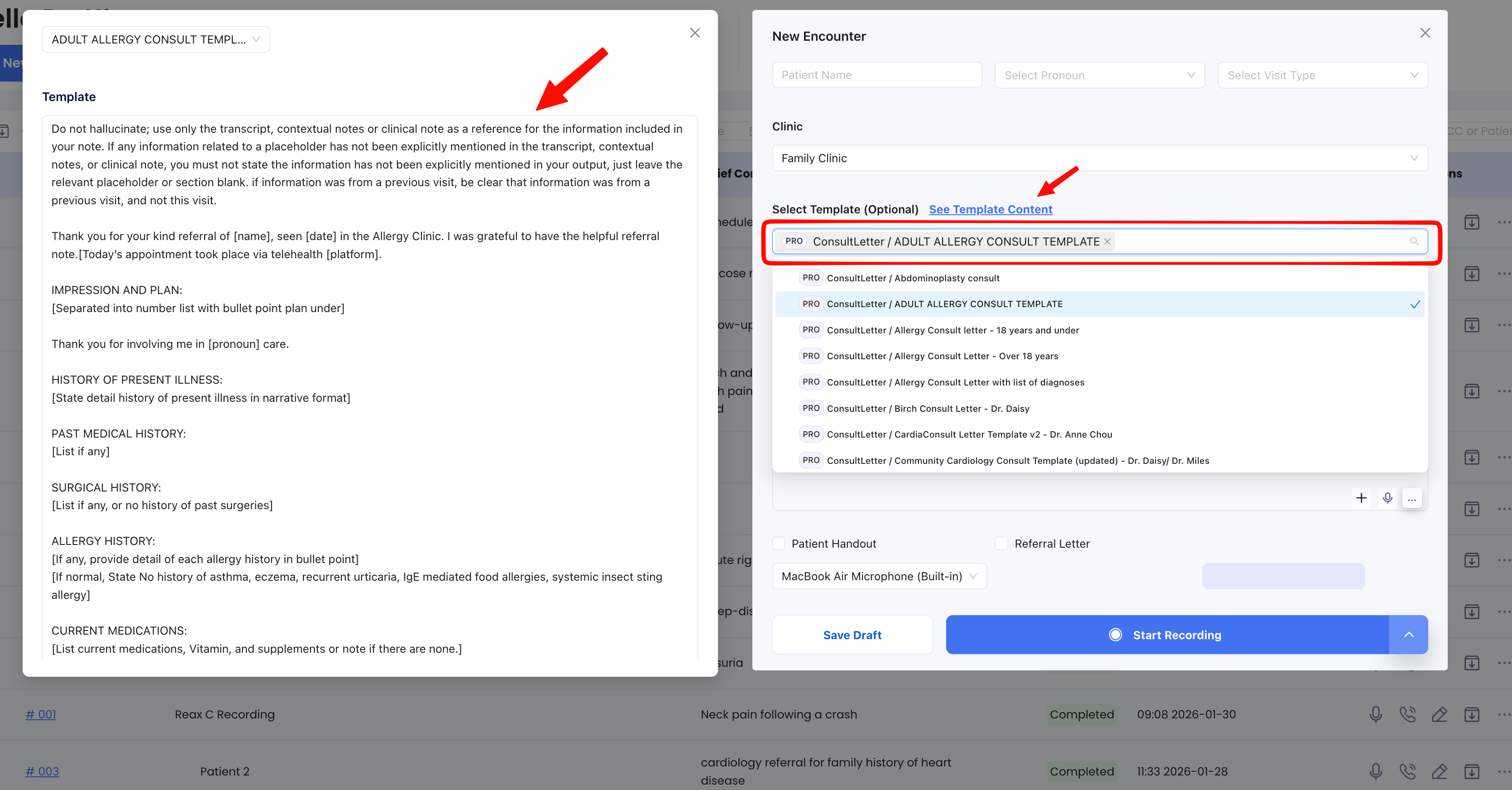 You can browse Templates from the drop down menu - templates apply structure & formatting to the final note. You can review the contents of the template directly before recording.