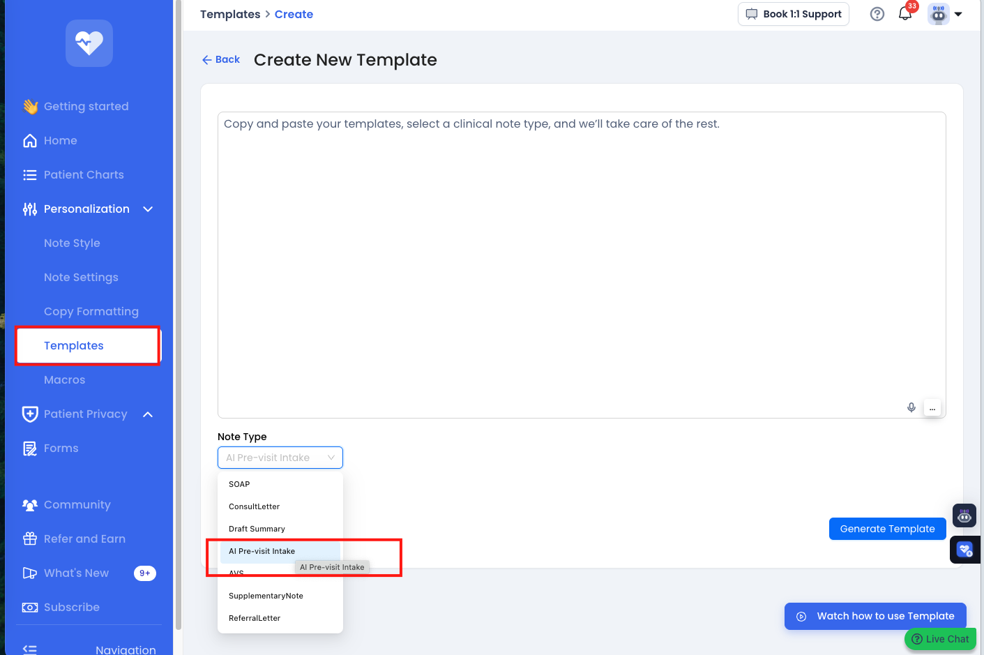 2. After selecting the note type as "AI Pre-Visit Intake", click on "Upload to Generate Template".