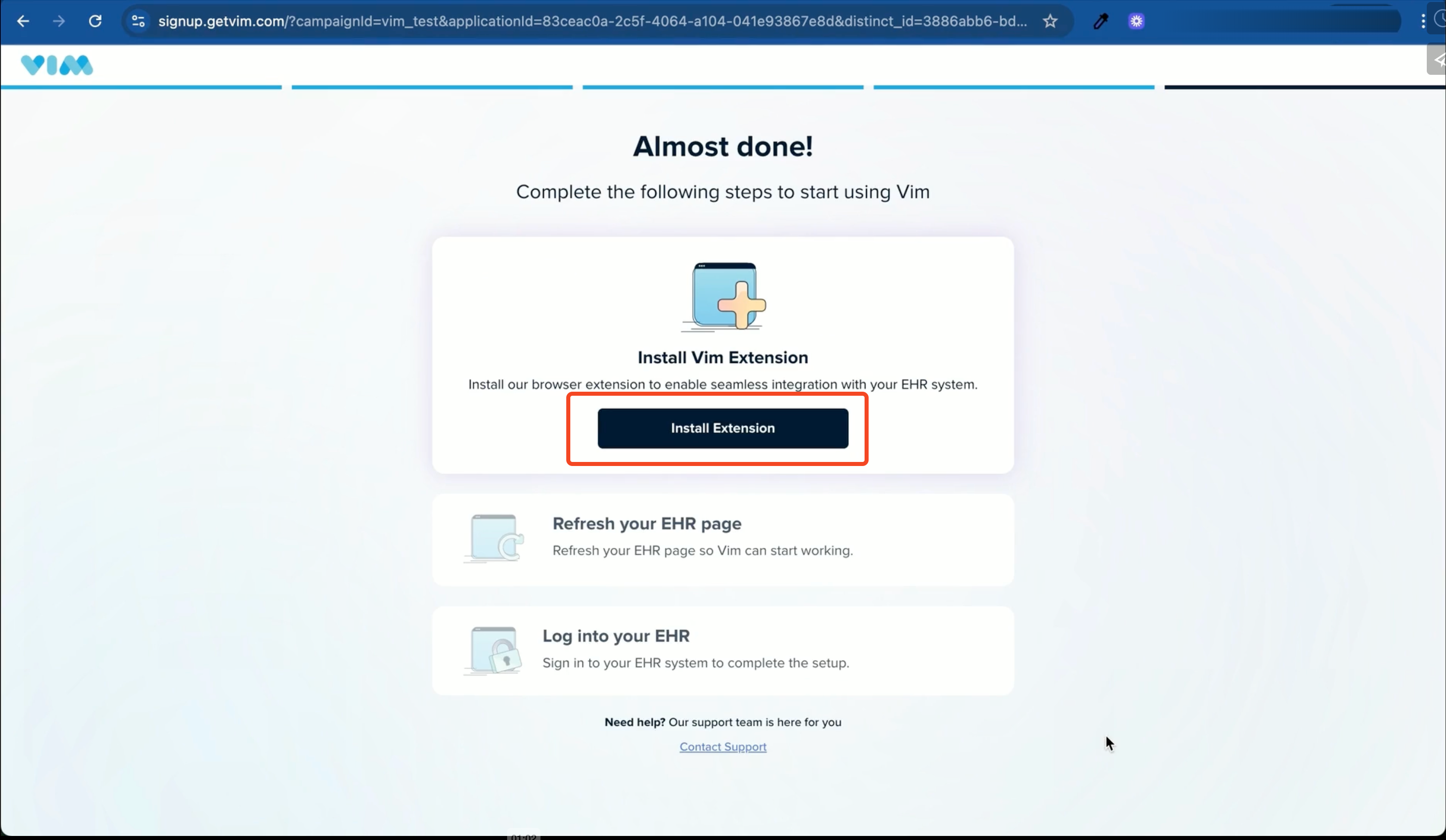 4. Once your VIM account is confirmed, follow the instructions to install the VIM Chrome extension. You will then need to refresh your EHR page & login to your EHR